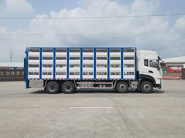 可选配不同的分层结构,装载量大,可装运不同生长周期的猪;机动灵活,车辆通过性好;铝合金箱体,质量轻、强度高;侧窗结构,通风性好。