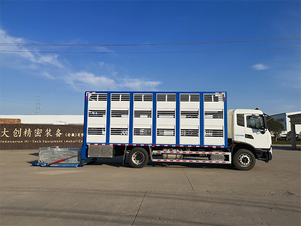 可选配不同的分层结构,装载量大,可装运不同生长周期的猪;机动灵活,车辆通过性好;铝合金箱体,质量轻、强度高;侧窗结构,通风性好。